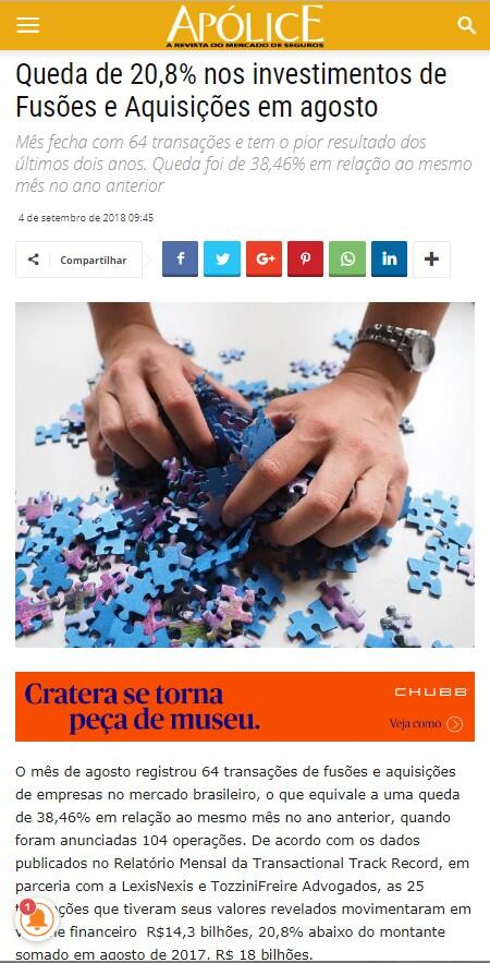 O mês de agosto registrou 64 transações de fusões e aquisições de empresas no mercado brasileiro, o que equivale a uma queda de 38,46% em relação ao mesmo mês no ano anterior, quando foram anunciadas 104 operações. De acordo com os dados publicados no Relatório Mensal da Transactional Track Record, em parceria com a LexisNexis e TozziniFreire Advogados, as 25 transações que tiveram seus valores revelados movimentaram em volume financeiro R$14,3 bilhões, 20,8% abaixo do montante somado em agosto de 2017, R$ 18 bilhões.