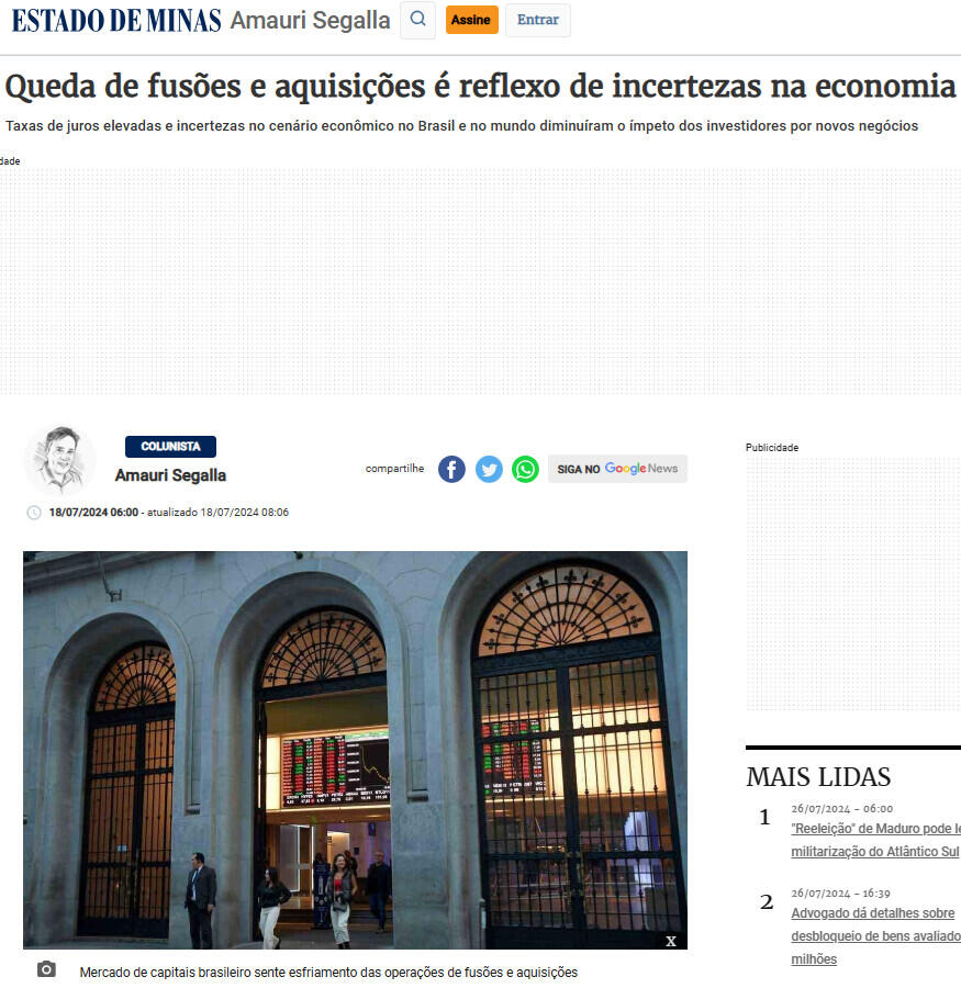 Taxas de juros elevadas e incertezas no cenário econômico no Brasil e no mundo diminuíram o ímpeto dos investidores por novos negócios e, em consequência, o mercado acabou esfriando. Como tem ocorrido nos últimos anos, o setor de tecnologia liderou as transações no país – 159 associações entre empresas do ramo foram feitas no primeiro semestre de 2024.