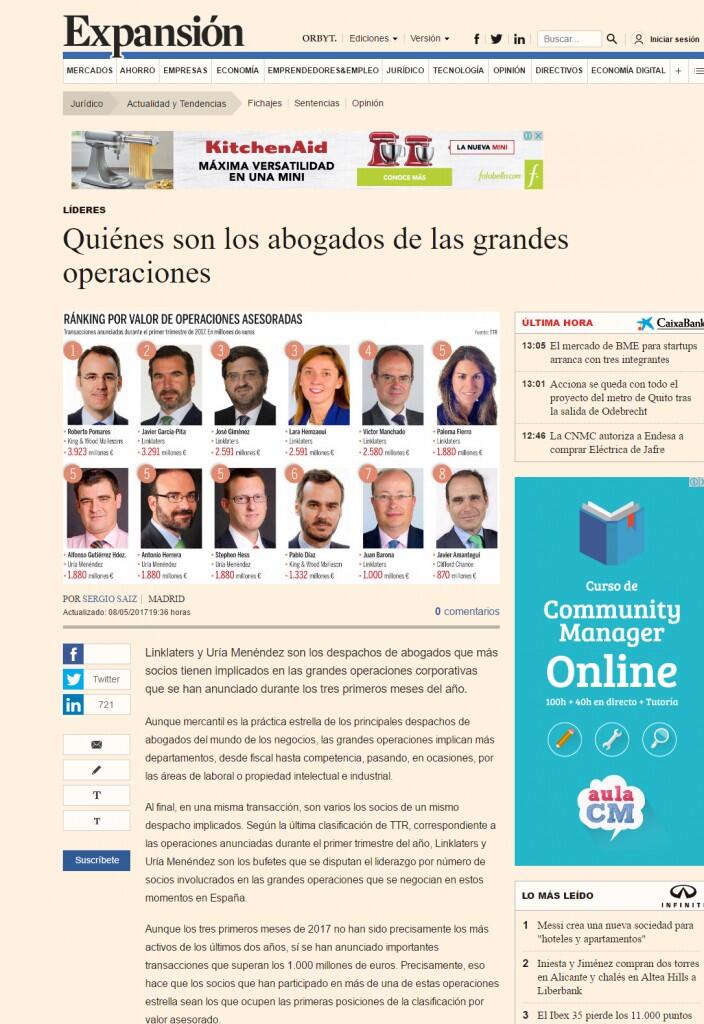 Al final, en una misma transacción, son varios los socios de un mismo despacho implicados. Según la última clasificación de TTR, correspondiente a las operaciones anunciadas durante el primer trimestre del año, Linklaters y Uría Menéndez son los bufetes que se disputan el liderazgo por número de socios involucrados en las grandes operaciones que se negocian en estos momentos en España.