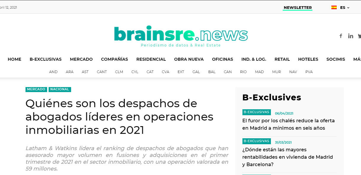En este sentido, Latham & Watkins lidera el ranking de despachos de abogados que han asesorado mayor volumen en fusiones y adquisiciones (M&A) en el primer trimestre de 2021 en el sector inmobiliario. En concreto, ha estado involucrado en la compra de 22 supermercado Eroski adquiridos por Blackbrook Capital a Lar España, cuyo importe ha ascendido a 59 millones de euros.