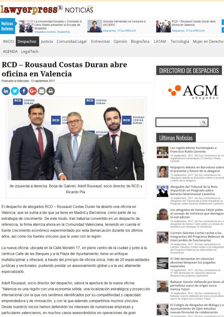 El despacho de abogados RCD – Rousaud Costas Duran ha abierto una oficina en Valencia, que se suma a las que ya tiene en Madrid y Barcelona, como parte de su estrategia de crecimiento. De este modo, tras haberse convertido en un despacho de referencia, la firma aterriza ahora en la Comunidad Valenciana, teniendo en cuenta el fuerte crecimiento económico experimentado por esta demarcación durante los últimos años, así como los fuertes vínculos que le unen con la región.