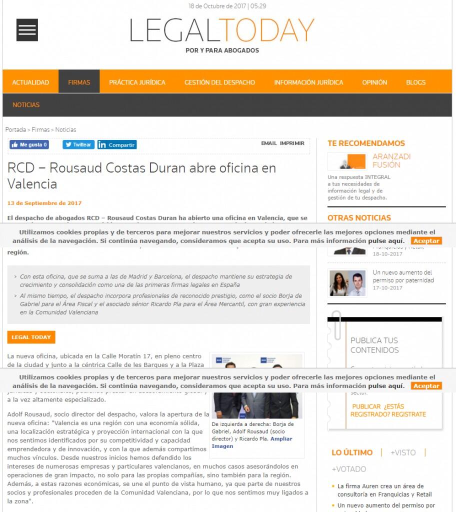 El despacho de abogados RCD – Rousaud Costas Duran ha abierto una oficina en Valencia, que se suma a las que ya tiene en Madrid y Barcelona, como parte de su estrategia de crecimiento. De este modo, tras haberse convertido en un despacho de referencia, la firma aterriza ahora en la Comunidad Valenciana, teniendo en cuenta el fuerte crecimiento económico experimentado por esta demarcación durante los últimos años, así como los fuertes vínculos que le unen con la región.