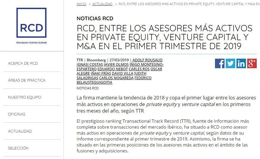 El prestigioso ranking Transactional Track Record (TTR), fuente de información más completa sobre transacciones del mercado ibérico, ha situado a RCD como asesor más activo en operaciones de private equity y venture capital, según datos de su informe correspondiente al primer trimestre de 2019. Asimismo, la firma se ha situado en las primeras posiciones de los asesores más activos en el ámbito de las fusiones y adquisiciones.