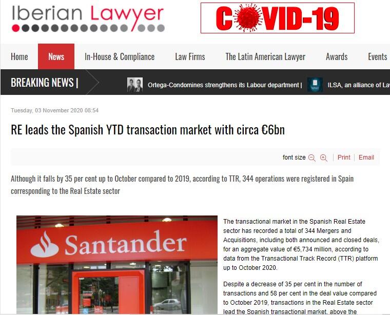 The transactional market in the Spanish Real Estate sector has recorded a total of 344 Mergers and Acquisitions, including both announced and closed deals, for an aggregate value of €5,734 million, according to data from the Transactional Track Record (TTR) platform up to October 2020.