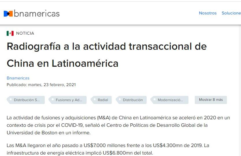 La actividad de fusiones y adquisiciones (M&A) de China en Latinoamérica se aceleró en 2020 en un contexto de crisis por el COVID-19, señaló el Centro de Políticas de Desarrollo Global de la Universidad de Boston en un informe.