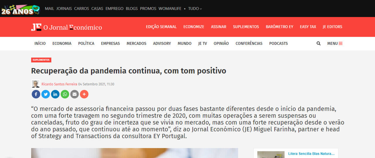 “O mercado de assessoria financeira passou por duas fases bastante diferentes desde o início da pandemia, com uma forte travagem no segundo trimestre de 2020, com muitas operações a serem suspensas ou canceladas, fruto do grau de incerteza que se vivia no mercado, mas com uma forte recuperação desde o verão do ano passado, que continuou até ao momento”, diz ao Jornal Económico (JE) Miguel Farinha, partner e head of Strategy and Transactions da consultora EY Portugal. “Entre março e junho de 2020, devido à forte contração económica e à incerteza relativamente ao processo de recuperação económica, os agentes económicos optaram por diferir os seus investimentos. Após este período, o mercado recuperou, em resultado das políticas expansionistas de apoio à economia por parte de governos e bancos centrais”, acrescenta João Sousa Leal, partner de Advisory da consultora KPMG e especialista em M&A.