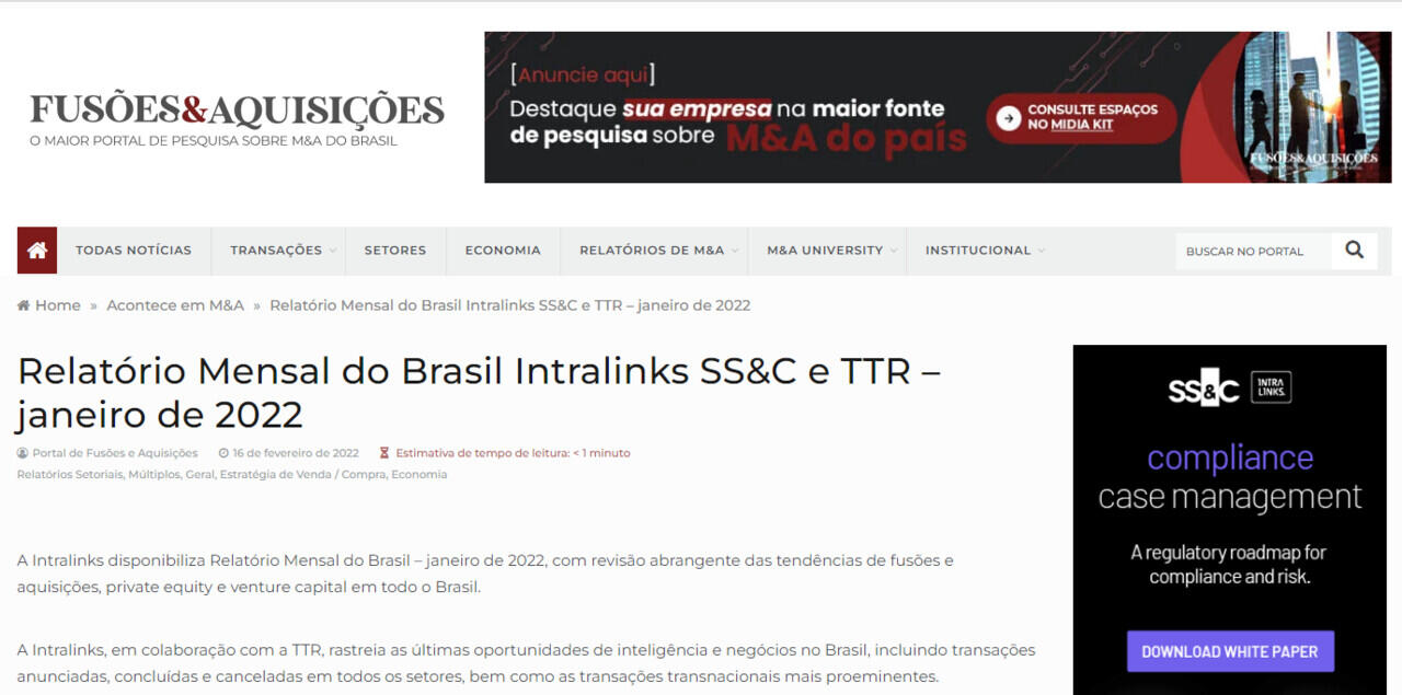 Relatório Mensal do Brasil Intralinks SS&C e TTR – janeiro de 2022