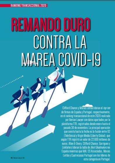 Clifford Chance y Morais Leitão lideran el top ten de firmas de España y Portugal, respectivamente, en el ranking transaccional de este 2020 realizado por Iberian Lawyer con datos aportados por la plataforma TTR, registrados desde enero hasta el pasado 30 de noviembre. La principal operación que consta hasta la fecha es la fusión entre 02 (Telefónica) y Virgin Media (Liberty Global), que según TTR registró un valor de 22.600 millones de euros. Allen & Overy, Clifford Chance, Garrigues y Linklaters lideran la tabla de Best Dealmakers en España mientras que VdA, CS Associados, Morais Leitão y Cuatrecasas Portugal son los líderes de esta categoría en Portugal.