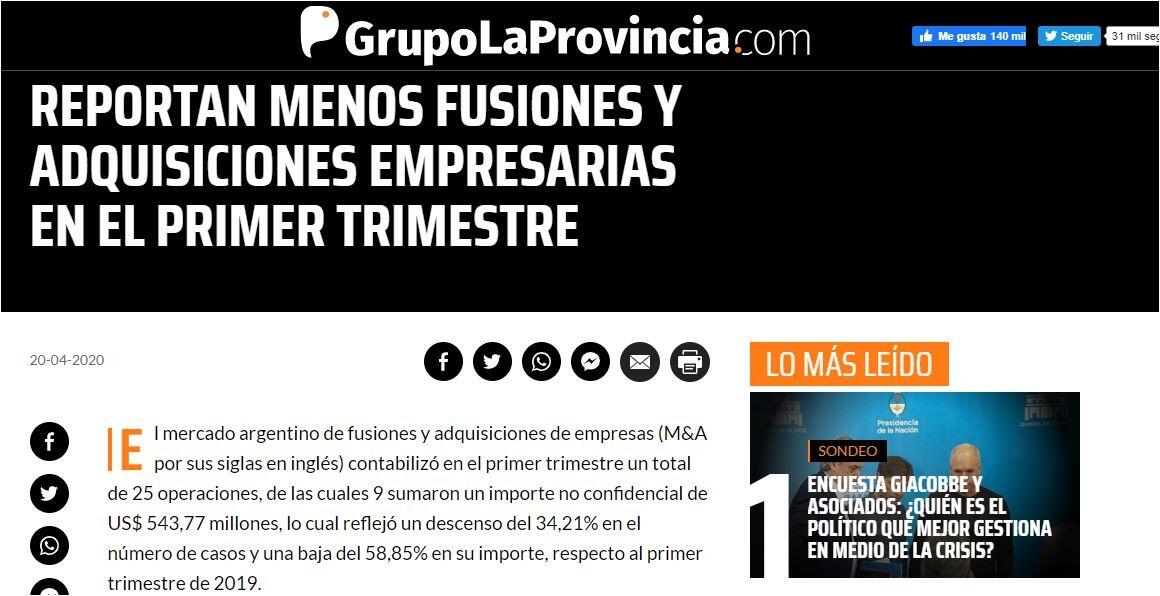 El mercado argentino de fusiones y adquisiciones de empresas (M&A por sus siglas en inglés) contabilizó en el primer trimestre un total de 25 operaciones, de las cuales 9 sumaron un importe no confidencial de US$ 543,77 millones, lo cual reflejó un descenso del 34,21% en el número de casos y una baja del 58,85% en su importe, respecto al primer trimestre de 2019.