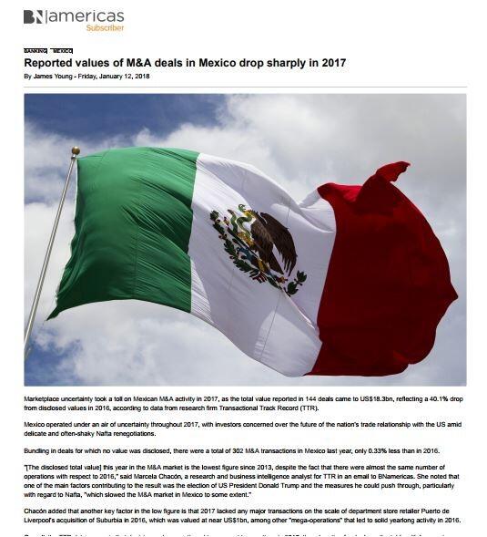 Marketplace uncertainty took a toll on Mexican M&A activity in 2017, as the total value reported in 144 deals came to US$18.3bn, reflecting a 40.1% drop from disclosed values in 2016, according to data from research firm Transactional Track Record (TTR).