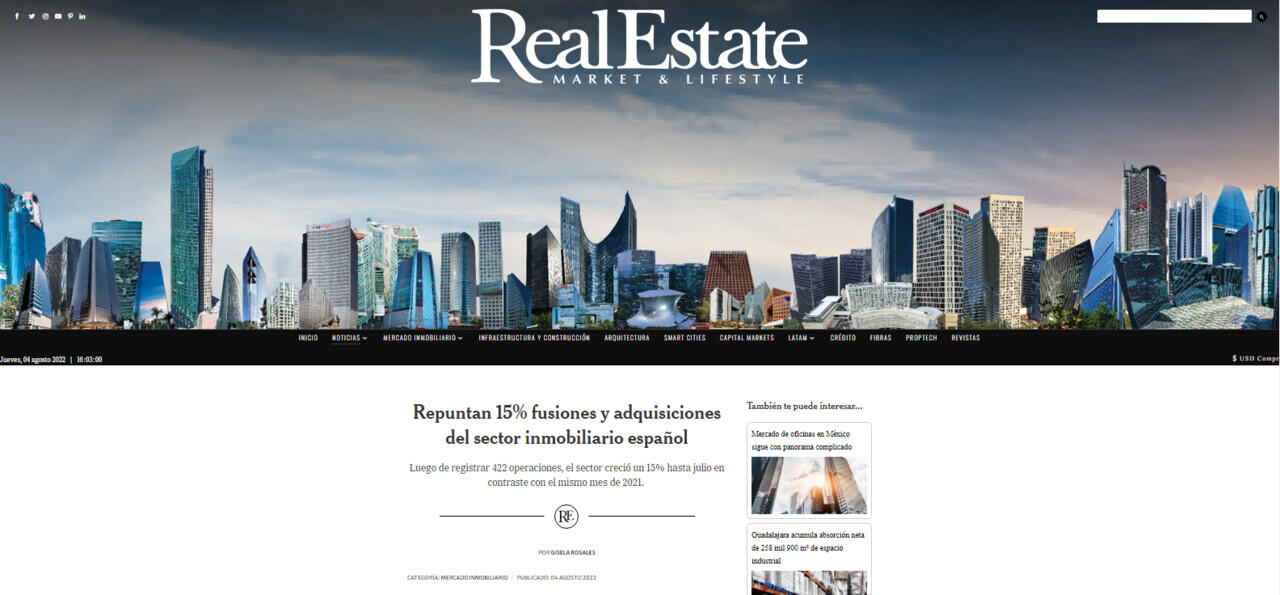 Luego de registrar un total de 422 operaciones, el volumen de fusiones y adquisiciones del sector inmobiliario español creció un 15% hasta el mes de julio, en contraste con el mismo mes pero del año anterior.