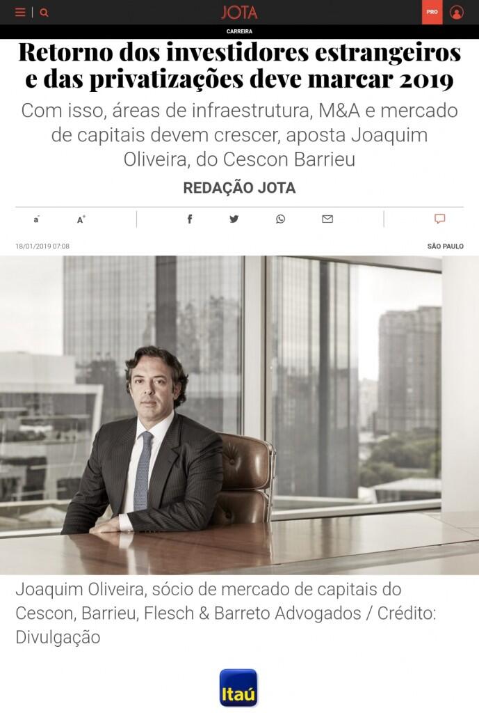 Em 2019, na avaliação de Joaquim Oliveira, sócio de mercado de capitais e managing partner do Cescon, Barrieu, Flesch & Barreto Advogados, espera-se que haja um retorno dos investidores estrangeiros e das privatizações no Brasil.