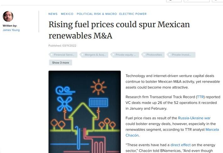 Technology and internet-driven venture capital deals continue to bolster Mexican M&A activity, yet renewable assets could become more attractive. Research firm Transactional Track Record (TTR) reported VC deals made up 26 of the 52 operations it recorded in January and February. Fuel price rises as result of the Russia-Ukraine war could bolster energy deals, however, especially in the renewables segment, according to TTR analyst Marcela Chacón.
