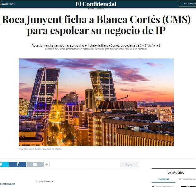 Roca Junyent ha cerrado hace unos días el fichaje de Blanca Cortés, procedente de CMS Albiñana & Suárez de Lezo, como nueva socia del área de propiedad intelectual e industrial