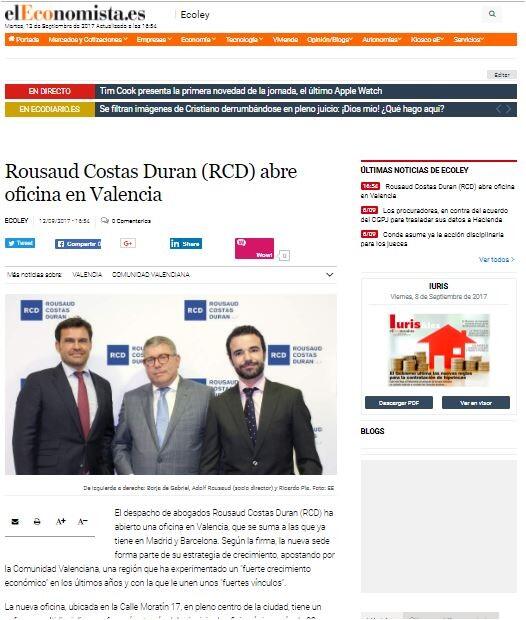 El despacho de abogados Rousaud Costas Duran (RCD) ha abierto una oficina en Valencia, que se suma a las que ya tiene en Madrid y Barcelona. Según la firma, la nueva sede forma parte de su estrategia de crecimiento, apostando por la Comunidad Valenciana, una región que ha experimentado un "fuerte crecimiento económico" en los últimos años y con la que le unen unos "fuertes vínculos".