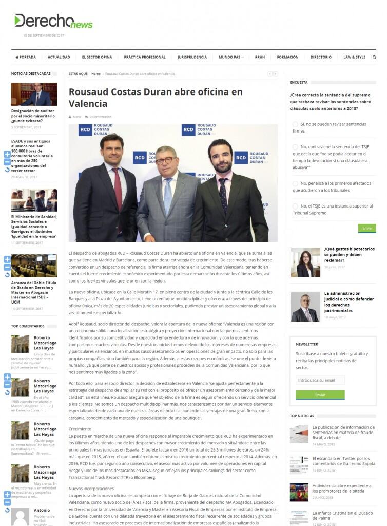 El despacho de abogados RCD – Rousaud Costas Duran ha abierto una oficina en Valencia, que se suma a las que ya tiene en Madrid y Barcelona, como parte de su estrategia de crecimiento. De este modo, tras haberse convertido en un despacho de referencia, la firma aterriza ahora en la Comunidad Valenciana, teniendo en cuenta el fuerte crecimiento económico experimentado por esta demarcación durante los últimos años, así como los fuertes vínculos que le unen con la región.