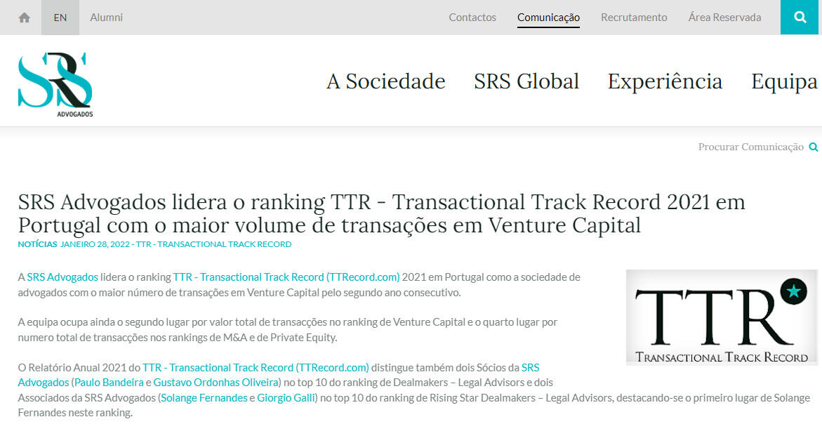 A SRS Advogados lidera o ranking TTR - Transactional Track Record (TTRecord.com) 2021 em Portugal como a sociedade de advogados com o maior número de transações em Venture Capital pelo segundo ano consecutivo.
