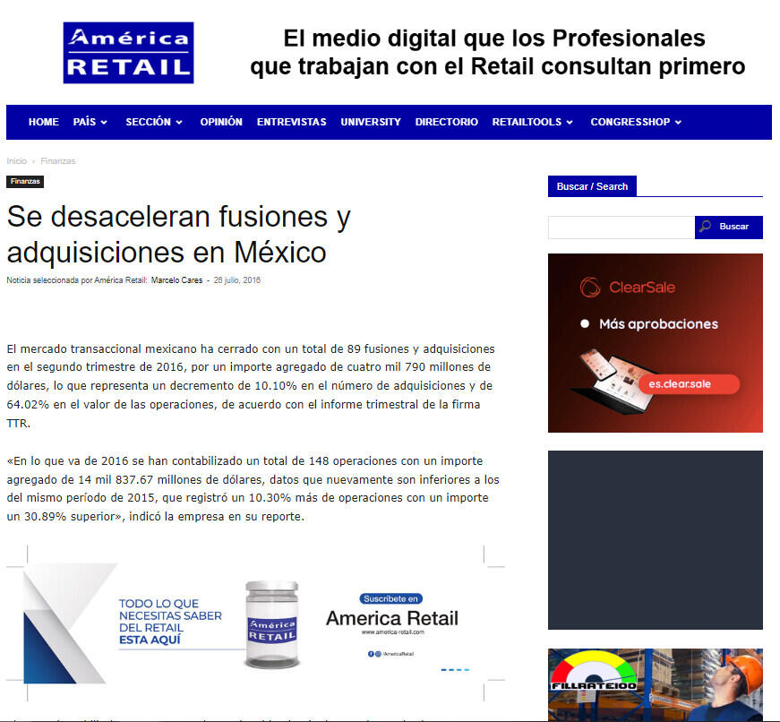 El mercado transaccional mexicano ha cerrado con un total de 89 fusiones y adquisiciones en el segundo trimestre de 2016, por un importe agregado de cuatro mil 790 millones de dólares, lo que representa un decremento de 10.10% en el número de adquisiciones y de 64.02% en el valor de las operaciones, de acuerdo con el informe trimestral de la firma TTR.