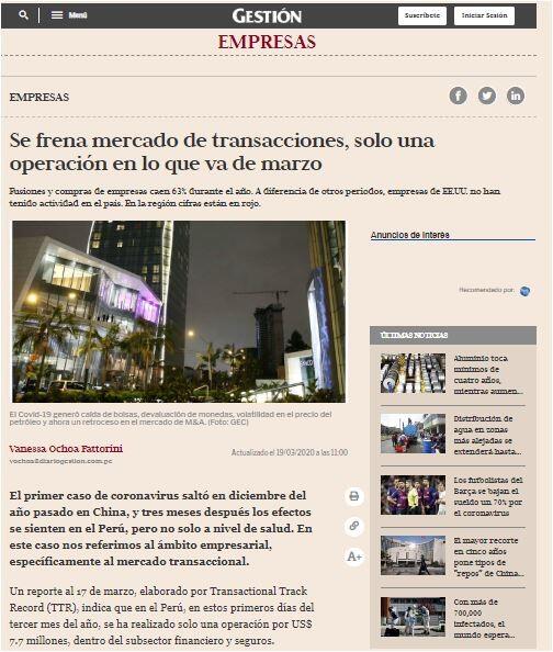 El primer caso de coronavirus saltó en diciembre del año pasado en China, y tres meses después los efectos se sienten en el Perú, pero no solo a nivel de salud. En este caso nos referimos al ámbito empresarial, específicamente al mercado transaccional.