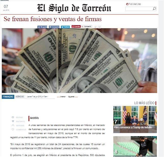 A unas semanas de las elecciones presidenciales en México, el mercado de fusiones y adquisiciones en el país cayó 7.6 por ciento en número de transacciones en mayo de 2018, aunque en el monto de compras se registró un aumento de 11 por ciento, indican datos de la firma TTR.