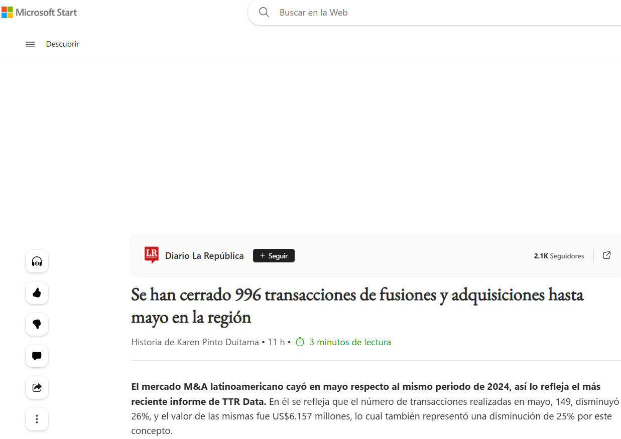 El mercado M&A latinoamericano cayó en mayo respecto al mismo periodo de 2024, así lo refleja el más reciente informe de TTR Data. En él se refleja que el número de transacciones realizadas en mayo, 149, disminuyó 26%, y el valor de las mismas fue US$6.157 millones, lo cual también representó una disminución de 25% por este concepto.