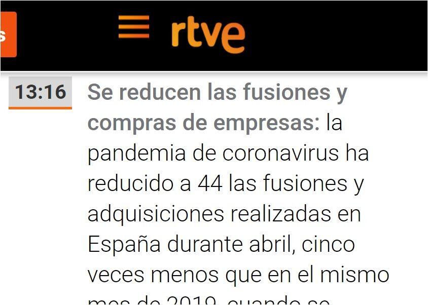 La pandemia de coronavirus ha reducido a 44 las fusiones y adquisiciones realizadas en España durante abril, cinco veces menos que en el mismo mes de 2019, cuando se cerraron 231 operaciones. Según el último informe de la consultora TTR, difundido este lunes, el importe de estas operaciones ha alcanzado 1.398 millones de euros, frente a los 10.501 millones del mismo mes de 2019.