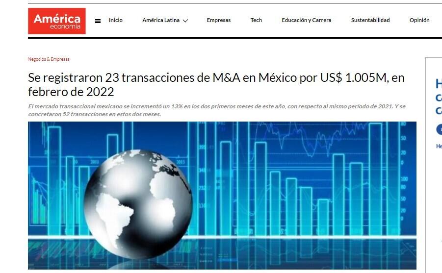 Se registraron 23 transacciones de M&A en México por US$ 1.005M, en febrero de 2022