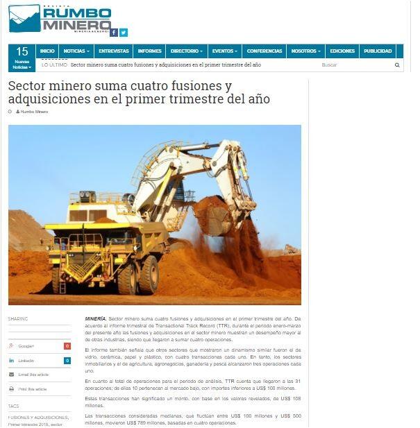 Sector minero suma cuatro fusiones y adquisiciones en el primer trimestre del año. De acuerdo al informe trimestral de Transactional Track Record (TTR), durante el periodo enero-marzo del presente año las fusiones y adquisiciones en el sector minero muestran un desempeño mayor al de otras industrias, siendo que llegaron a sumar cuatro operaciones.