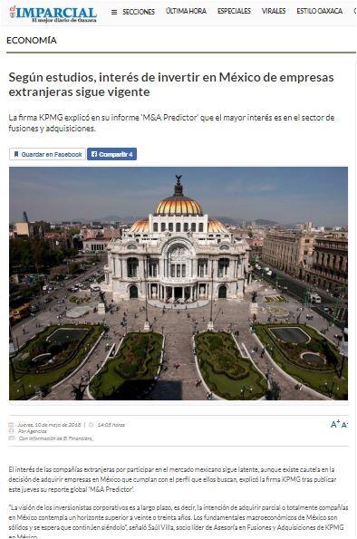 “La visión de los inversionistas corporativos es a largo plazo, es decir, la intención de adquirir parcial o totalmente compañías en México contempla un horizonte superior a veinte o treinta años. Los fundamentales macroeconómicos de México son sólidos y se espera que continúen siéndolo”, señaló Saúl Villa, socio líder de Asesoría en Fusiones y Adquisiciones de KPMG en México.