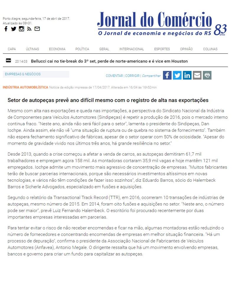 Segundo o relatório da Transactional Track Record (TTR), em 2016, ocorreram 10 transações de indústrias de autopeças, mesmo número de 2015. Em 2014, foram oito fusões e aquisições no setor. "Neste ano, o número pode ser maior", prevê Luiz Fernando Halembeck. O escritório foi procurado recentemente por duas importantes empresas interessadas em parcerias.