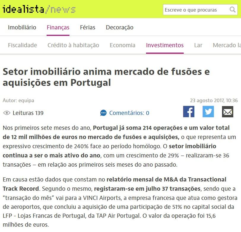 Em causa estão dados que constam no relatório mensal de M&A da Transactional Track Record. Segundo o mesmo, registaram-se em julho 37 transações, sendo que a “transação do mês” vai para a VINCI Airports, a empresa francesa que atua como gestora de aeroportos, que concluiu a aquisição de uma participação de 51% no capital social da LFP - Lojas Francas de Portugal, da TAP Air Portugal. O valor da operação foi 15,6 milhões de euros.