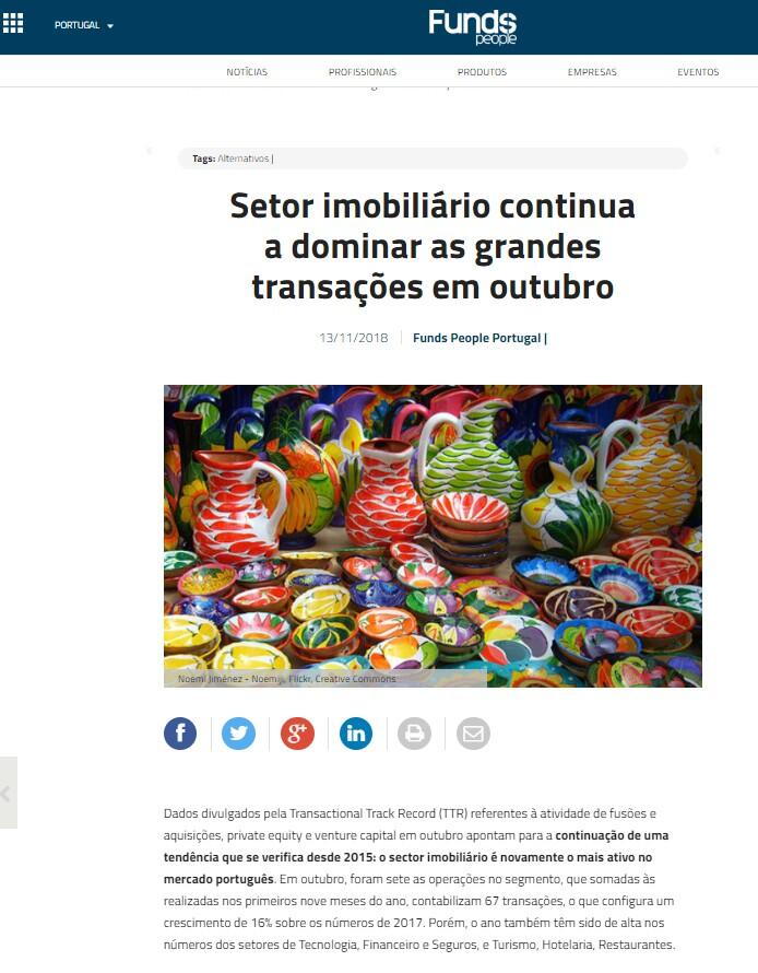 Dados divulgados pela Transactional Track Record (TTR) referentes à atividade de fusões e aquisições, private equity e venture capital em outubro apontam para a continuação de uma tendência que se verifica desde 2015: o sector imobiliário é novamente o mais ativo no mercado português. Em outubro, foram sete as operações no segmento, que somadas às realizadas nos primeiros nove meses do ano, contabilizam 67 transações, o que configura um crescimento de 16% sobre os números de 2017. Porém, o ano também têm sido de alta nos números dos setores de Tecnologia, Financeiro e Seguros, e Turismo, Hotelaria, Restaurantes.