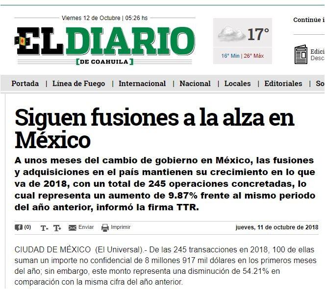 A unos meses del cambio de gobierno en México, las fusiones y adquisiciones en el país mantienen su crecimiento en lo que va de 2018, con un total de 245 operaciones concretadas, lo cual representa un aumento de 9.87% frente al mismo periodo del año anterior, informó la firma TTR.