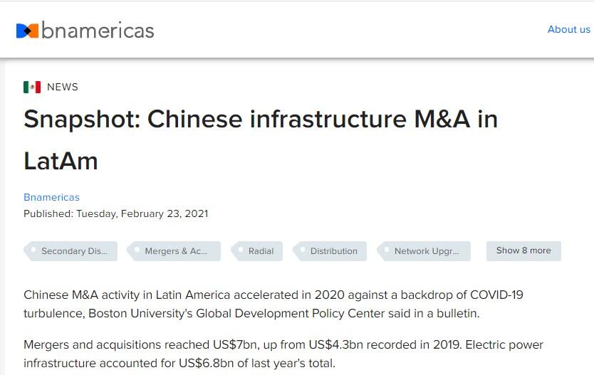 Chinese M&A activity in Latin America accelerated in 2020 against a backdrop of COVID-19 turbulence, Boston University's Global Development Policy Center said in a bulletin.