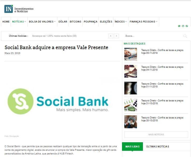 O Social Bank - que permite que as pessoas realizem qualquer tipo de transação entre si a partir de uma conta de pagamento digital, acaba de anunciar a compra da Vale Presente, maior operação de gift cards personalizados da América Latina, que pertencia à HUB Fintech.
