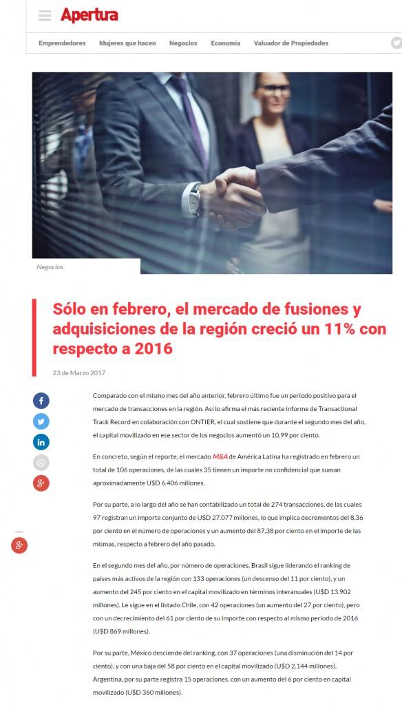 Sólo en febrero, el mercado de fusiones y adquisiciones de la región creció un 11% con respecto a 2016