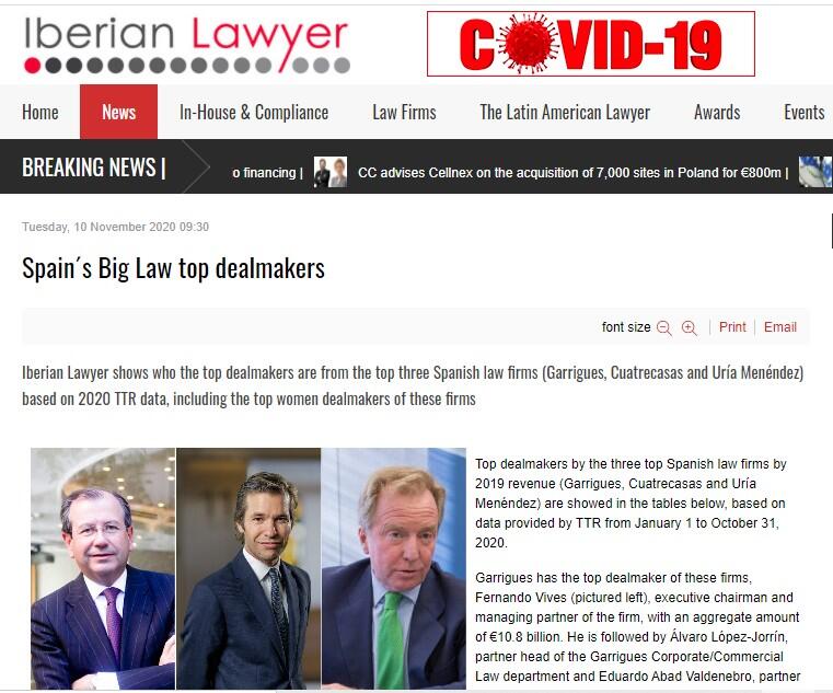 Top dealmakers by the three top Spanish law firms by 2019 revenue (Garrigues, Cuatrecasas and Uría Menéndez) are showed in the tables below, based on data provided by TTR from January 1 to October 31, 2020.