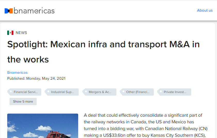 Meanwhile, the CN buyout of KCS is one of six transactions initiated in 2021 and currently ongoing that are related to Mexican construction, infrastructure, logistics and transportation firms, according to TTR data.