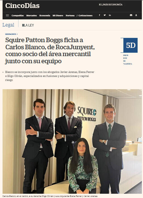 Asimismo, Javier Arenas se incorpora como asociado senior y Elena Ferrer e Iñigo Oliván se incorporan como asociados del departamento de mercantil de Squire Patton Boggs en Madrid. Los tres son abogados mercantilistas con experiencia en M&A, private equity y venture capital.