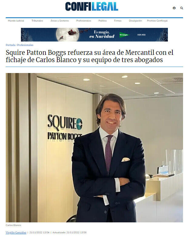Blanco se incorpora desde RocaJunyent reforzando la práctica mercantil transaccional y de capital riesgo de Squire Patton Boggs en Madrid con un equipo de tres abogados compuesto por Javier Arenas, Elena Ferrer e Iñigo Oliván.