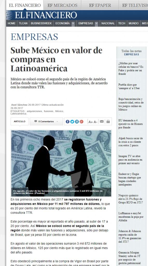 México se colocó como el segundo país de la región de América Latina donde más valen las fusiones y adquisiciones, de acuerdo con la consultora TTR.