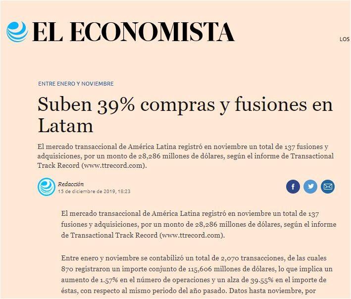 El mercado transaccional de América Latina registró en noviembre un total de 137 fusiones y adquisiciones, por un monto de 28,286 millones de dólares, según el informe de Transactional Track Record