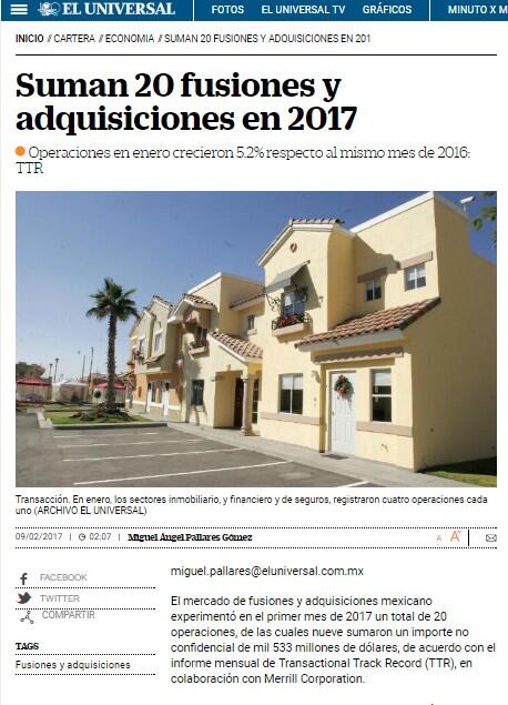 CIUDAD DE MÉXICO, febrero 8 (EL UNIVERSAL).- El mercado de fusiones y adquisiciones mexicano experimentó en el primer mes de 2017 un total de 20 operaciones, de las cuales 9 suman un importe no confidencial de mil 533 millones de dólares, de acuerdo con el informe mensual de Transactional Track Record (TTR) en colaboración con Merrill Corporation.
