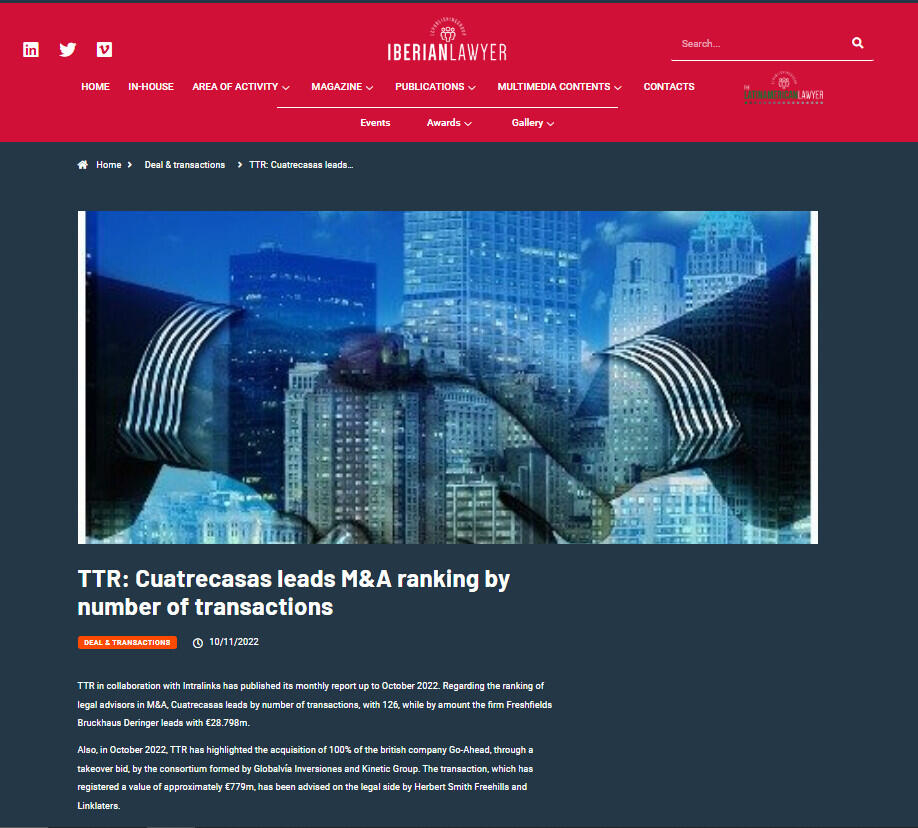 TTR: Cuatrecasas leads M&A ranking by number of transactions