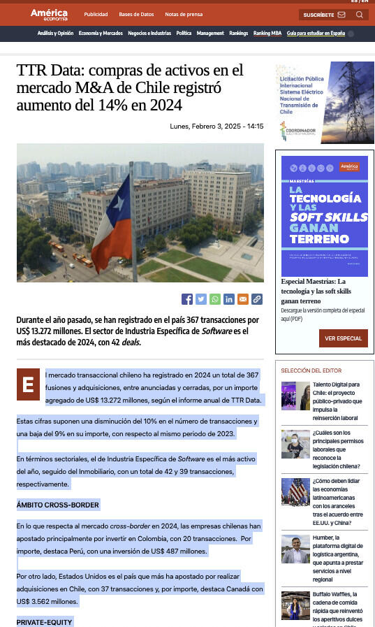 TTR Data: compras de activos en el mercado M&A de Chile registró aumento del 14% en 2024