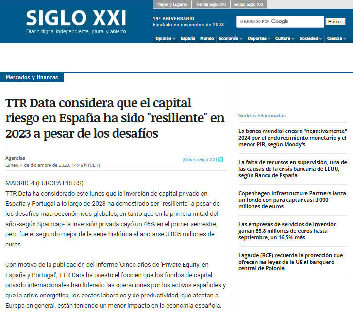 TTR Data considera que el capital riesgo en España ha sido "resiliente" en 2023 a pesar de los desafíos