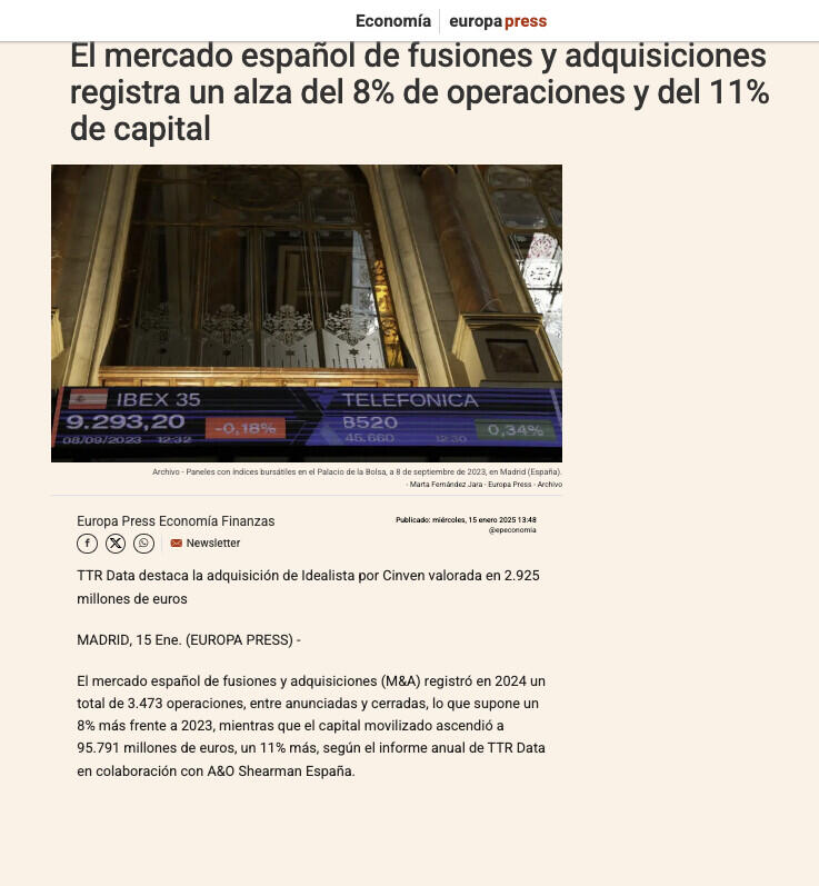 El mercado español de fusiones y adquisiciones (M&A) registró en 2024 un total de 1.016 operaciones, con un descenso interanual del 4%, mientras que el volumen de inversión cayó un 16%, hasta los 40.299 millones de euros.