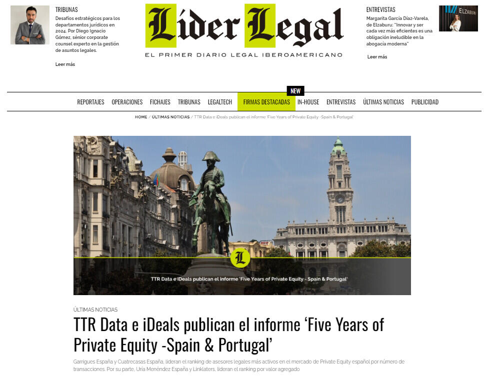Según el ranking legal de TTR Data en el mercado de private equity en España lo lidera en 2023, por volumen de transacciones, Garrigues España y Cuatrecasas España, con 44 operaciones cada uno. Por valor, lidera Uría Menéndez España, con un valor agregado de 10.500 millones de euros; y Linklaters España, con 7.400 millones de euros.