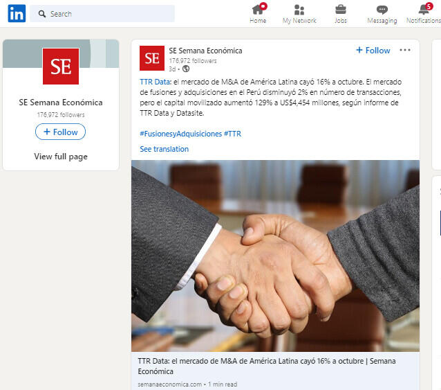 TTR Data: el mercado de M&A de América Latina cayó 16% a octubre. El mercado de fusiones y adquisiciones en el Perú disminuyó 2% en número de transacciones, pero el capital movilizado aumentó 129% a US$4,454 millones, según informe de TTR Data y Datasite.