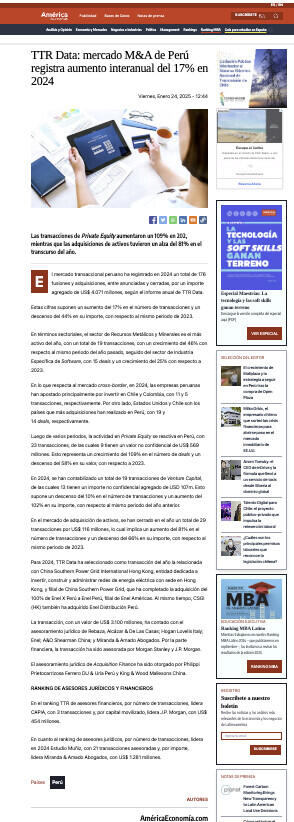 TTR Data: mercado M&A de Perú registra aumento interanual del 17% en 2024